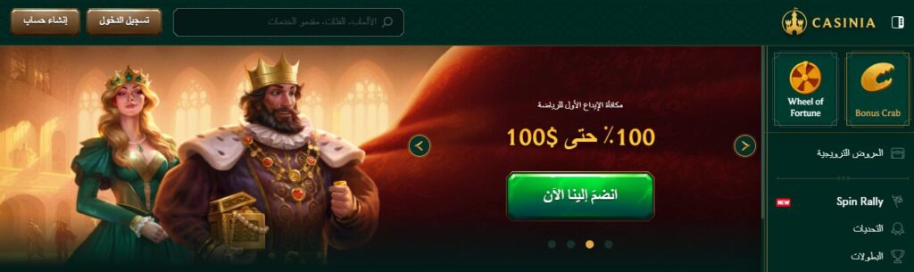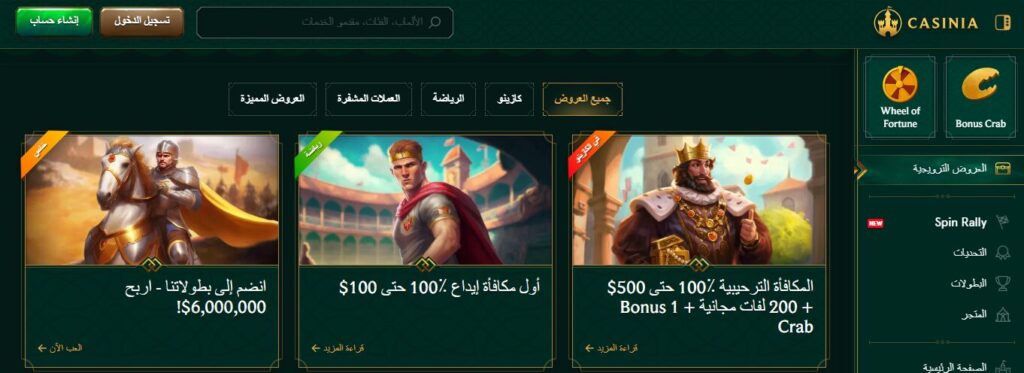 يقدّم Casinia عرض ترحيب يتضمن مطابقة 100% حتى 100دولار مع حد أدنى للإيداع 20 دولارًا، إضافة إلى رهانات مجانية مخصصة لقسم الرياضة وميزة ترويجية تفاعلية مثل Bonus Crab. خلال الاختبار، تم تفعيل المكافأة مباشرة بعد الإيداع، لكن تجدر الإشارة إلى أن احتساب شرط التدوير يختلف بحسب نوع الرهانات والسوق المختار، مع وجود حد أدنى لمعامل الرهان حتى تُحتسب ضمن المتطلبات.